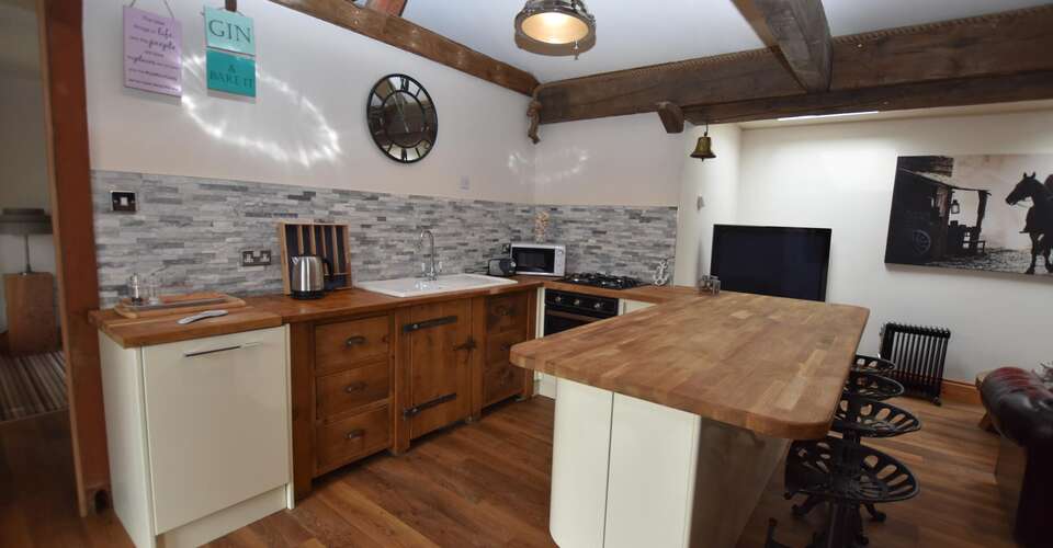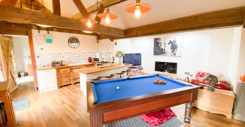 Our 2 large bedrooms come with en-suites. The super king bedroom comes equipped with grand barn doors which give it a great country feel. The entire accommodation comes furnished in traditional country living style. Both bedrooms have lovely views of pure countryside. An open-plan kitchen diner, with a luxury pool table in the centre of the accommodation allowing you to unwind or relax in the cosy lounge area.
